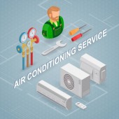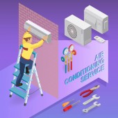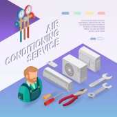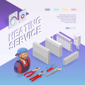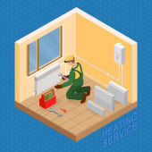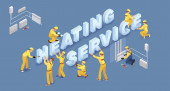 Ogrzewanie usługi. Koncepcja izometryczny remonty wnętrz. Pracowników, sprzęt i elementy ikony izometryczny. Konstruktor w jednolitej, profesjonalne narzędzia, grzejniki. Wektor płaskie ilustracja 3d.