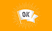 Flaga jest Ok. Old school Girlanda z tekstu to jest ok, w porządku. Wstążka flaga w stylu vintage z liniowej rysunku promienie światła, sunburst, promienie słońca, tekst ok. Ręcznie rysowane projekt. Ilustracja wektorowa