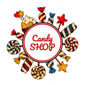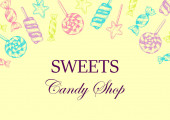 Candy shop napis logo etykiety lub godło dla projektu w ręku rysowane stylu. Ilustracja wektorowa, Eps 10.