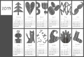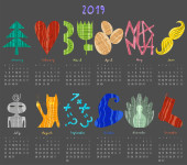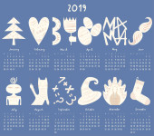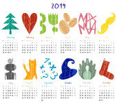 Kalendarzowy 2019 w płaski ręką narysowane numery. Kalendarz miesięczny z przedmiotów, zwierząt, napis