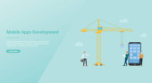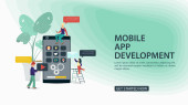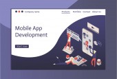 Wektor ilustracja koncepcja. Zespół kreatywnie współpracować w aplikacji mobilnej; Deweloperzy, seo, sieci społecznej. Szablon strony docelowej. Łatwo edytować i dostosować. Ilustracja wektorowa izometryczny.
