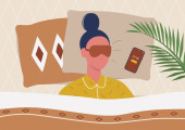 Śpiące tracker. Młoda kobieta postać poręczny gadżet na sobie w łóżku, aby kontrolować jakość snu. Ilustracja wektorowa płasko edytowalne, clipart