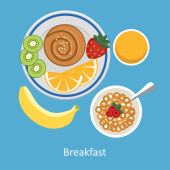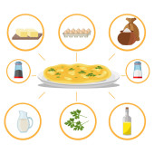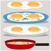 Jajecznicy z kiełbasą, warzywa i grzyby. Ilustracja wektorowa na temat żywności, widok z góry.