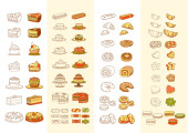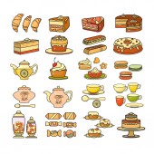 Wyroby cukiernicze ikona. Zestaw ładny różne ikony desery. Ilustracja wektorowa Płaska konstrukcja. Słodkie wypieki, herbatniki, izolowana na białym tle. Piekarnia sklep przepisy, ciasta i cukierni lub słodycze.