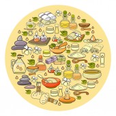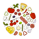 Płaska konstrukcja ładny kolorowy pizza składnika ikona na białym tle na tle światła koło wektor zestaw.