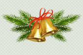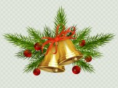 Boże Narodzenie skład świerkowe zielone gałązki, dwa złote dzwony z czerwoną wstążką