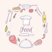 Ilustracja gotowania, narzędzia, naczynia, żywności i cytat. Dzieła sztuki twórczej atramentu. Rzeczywiste wektor rysunek. Zestaw kuchenny i tekst Let'S Eat