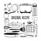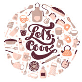 Ilustracja gotowania, narzędzia, naczynia, żywności i cytat. Dzieła sztuki twórczej atramentu. Rzeczywiste wektor rysunek. Zestaw kuchenny i tekst niech gotować