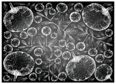 Tropikalne owoce, ilustracja tapeta tło odręczny szkic Guavasteen, Feijoa lub Acca Sellowiana i złota Apple lub Diospyros Decandra owoców na czarnej tablicy.