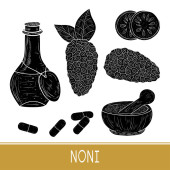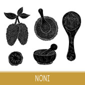 Zdjęcie "Noni. Owoców, liści, proszek, łyżka, zaprawy, miska, pigułki. Szkic. Zestaw. Kolor" może być wykorzystywane do celów osobistych i komercyjnych zgodnie z warunkami zakupionej licencji Royalty-free. Obraz jest dostępny do pobrania w jakości wysokiej rozdzielczości do 5760x3840.