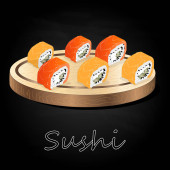 Różne rodzaje sushi serwowane na podłoże drewniane biurko czarne na białym tle.