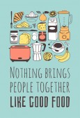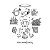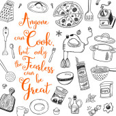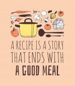 Ilustracja gotowania, narzędzia, naczynia, żywności i cytat. Dzieła sztuki twórczej atramentu. Rzeczywiste wektor rysunek. Zestaw kuchenny i tekst A przepis jest historia że kończy z A dobra mąka