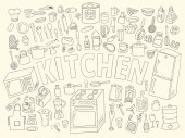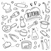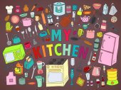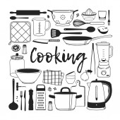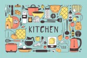 Ręcznie rysowane ilustracja przybory kuchenne i naczynia. Dzieła sztuki twórczej. Rzeczywiste wektor rysunek. Zestaw kuchenny