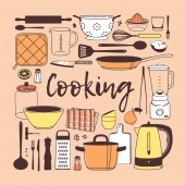 Ilustracja gotowania, narzędzia, naczynia i żywności. Dzieła sztuki twórczej atramentu. Rzeczywiste wektor rysunek. Zestaw kuchenny - wektor