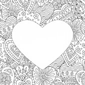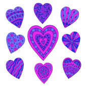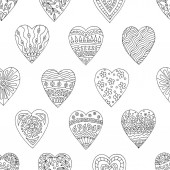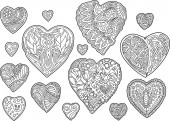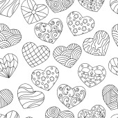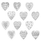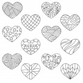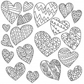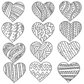 Ręcznie rysowane serca z wzorami, doodle dla kolorowanki na Walentynki