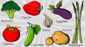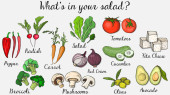 Wektor ilustracja Sałatka Menu szablon: Sałatka, marchew, rzodkiewka, brokuły, pomidory, ogórek, pieprz, cebula, pieczarki, ser Feta, oliwki, awokado