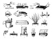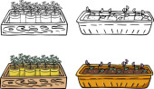 Czarno-biały rysunek z sadzonki roślin w polach i dymki. Wektor