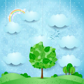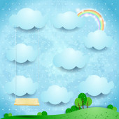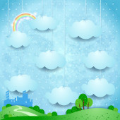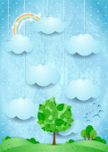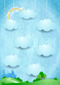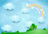 Surrealistyczny krajobraz z wiszące chmury i deszcz. Ilustracja wektorowa