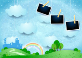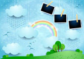 Surrealistyczny krajobraz z skyline i deszcz, ilustracji wektorowych