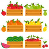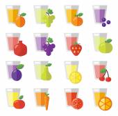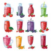 Kolekcja szklanych słoików wypełnionych domowej roboty dżemem owocowy. Truskawka, pomarańcza, cytryna, śliwka, owoce kiwi i marmolada. Domowy deser z galaretką w słoiku. Ilustracja wektora