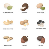 Zestaw typów różnych orzechów. Nasiona słonecznika, orzechów laskowych, pistacji, macadamia, pecan, kokosowe i inne.