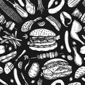 Vintage wektor monochromatyczne Grawerowanie bezszwowe wzór grilla. Widok z góry z węgiel drzewny, Grzyb, pomidor, papryka, kiełbasa, cytryny, kebab, stek z wołowiny i ryb.