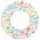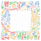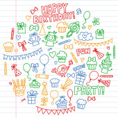 Wektor wzór na urodzinowe dla małego przedszkola, dzieci w wieku szkolnym. Rysowanie dla dzieci doodle stylu