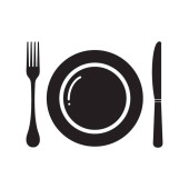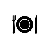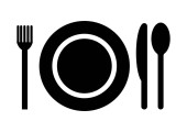 Ikona sztućce. Sylwetka talerz, wektor widelec i nóż. Na białym tle. kolor czarny