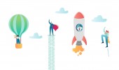 Postacie ludzi biznesu, latające w powietrzu balon w poszukiwaniu nowych idei. Rozwoju kariery super biznesmen. Rozwiązań i innowacji koncepcja z żarówką. Ilustracja wektorowa