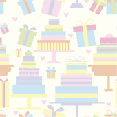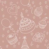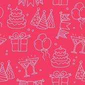 Wektor wzór z liniowej ikony dla urodzin na białym tle. Wliczone ciasto, Korona, kwiaty, notatki, serca, szkło.