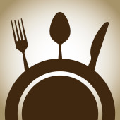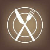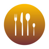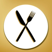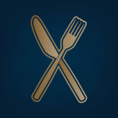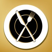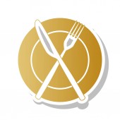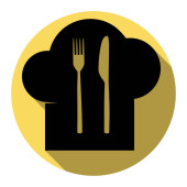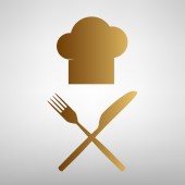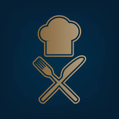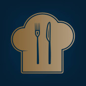 Szef kuchni kapelusz i łyżka, widelec, nóż znak. Wektor. Czarna ikona z jasny brązowy cień w białym kole z kształcie pierścienia na złotym tle.