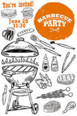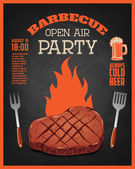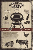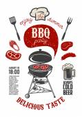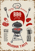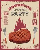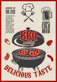 Vintage bbq party plakat szablon. Grill, stek, mięso, butelki piwa i kubek. Krowa, wieprzowina, kurczak rzeźnik diagramu. Ilustracja wektorowa