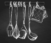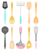 Naczynia kuchenne. Różnych łyżki i inne akcesoria. Na białym tle wektor ilustracja na białym tle.