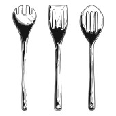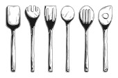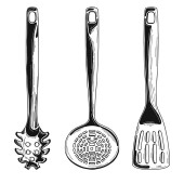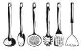 Naczynia kuchenne. Różnych łyżki i inne akcesoria. Na białym tle wektor ilustracja na białym tle.