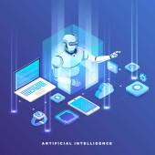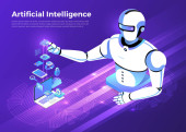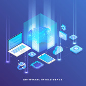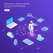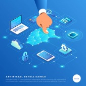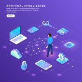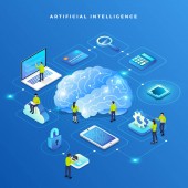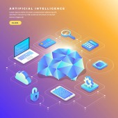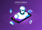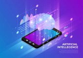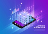 Izometryczne projektowanie koncepcja rozwiązania technologii mobilnych na górze ze sztuczną inteligencją. Gradientu tła i cyfrowy wykres wykresu cienka linia. Wektor ilustrują.