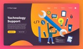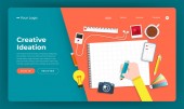 Płaska konstrukcja ilustracja koncepcja sieci web lub aplikacji projektant i programista siedzi pracę z komputera na biurku. Wektor ilustrują.