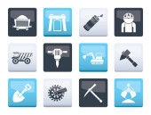 Kolorowy zestaw ikon przemysłowych budynkach wysokich i wysokościowych, ołówek, koparka i inne elementy grafitowe. Przemysłowe ikony ilustracja na białym tle wektorów.