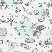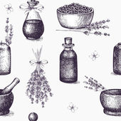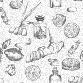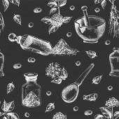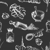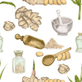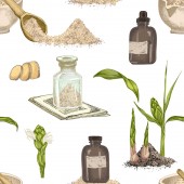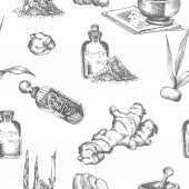 Kolorowy wzór szkic realistyczne atrament botaniczny korzeń żeń-szenia, kwiaty, jagody, butelka, moździerz na białym tle na białym tle, zakład medycyny. Ilustracja wektorowa rustykalnym stylu Vintage.