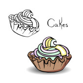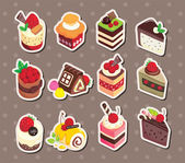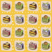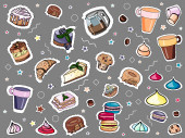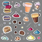 Naklejki, ciasto, słodycze na szarym tle kolorowe. rysowane ręcznie. Croisasan, ciasto czekoladowe, tiramisu, czajnik, kubek kolorowy