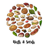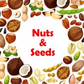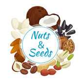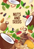 Nowoczesne strony ciągnione ramki z różnych orzechy i nasiona. Koncepcja zdrowej żywności ekologicznej. Tło wektor wzór