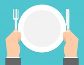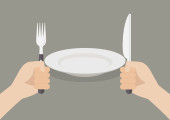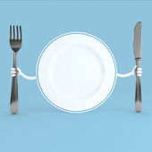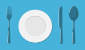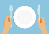 Pusta biała płytka. Widelec i nóż w ręku. Szablonu. Ilustracja wektorowa w stylu płaskim