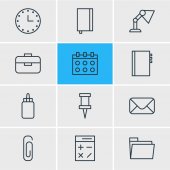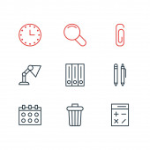 Ilustracja wektorowa 9 Artykuły papiernicze ikony stylu linii. Można edytować zestaw zegar, aktówki, rezerwowym i inne elementy ikony.