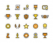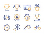 Wyróżnienie linii ikony. Zwycięzca medal, zwycięstwo Puchar i nagrodę trofeum. Zestaw ikon liniowe osiągnięcia. Wektor