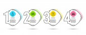 Infografika szablon 4 Opcje lub czynności. Zestaw czyszczenia mopa, pralka i wiadro ikony. Wiadro z mopem znak. Zamiatać podłogę, usługi pralnicze, mycie sprzętu. Sprzęt do czyszczenia. Wektor