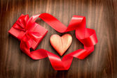 sztuka wakacje prezent z kokardą z wstążki i pokoju papieru życzenia na drewniane tła.