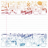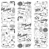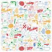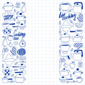 Wektor zestaw kuchni dla dzieci i gotowanie rysunków ikon w stylu Doodle. Malowane, kolorowe, zdjęcia na arkuszu papieru w kratkę na białym tle.