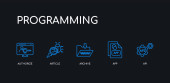 Zdjęcie "5 kontur skok niebieski Java, js, klawiatura i mysz, Strona docelowa, ikony aplikacji mobilnych z kolekcji programowania na czarnym tle. liniowe cienkie ikony edytowalne liniowo." może być wykorzystywane do celów osobistych i komercyjnych zgodnie z warunkami zakupionej licencji Royalty-free. Obraz jest dostępny do pobrania w jakości wysokiej rozdzielczości do 5760x3840.