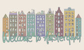 Dom i apartamenty w Europie. Zestaw cute architektury w Amsterdamie. Sąsiedztwo z klasyczną uliczkę i przytulne domy. Budowa i elewacje dla banner lub plakatu. Szkic Doodle.