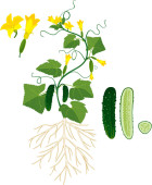 Widok ogólny rośliny cukinii z owoców, zielone liście, żółte kwiaty i system korzeniowy