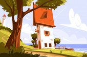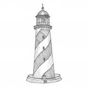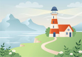 Latarnia morska na brzegu morza i błękitne niebo na tle-płaska ilustracja wektorowa